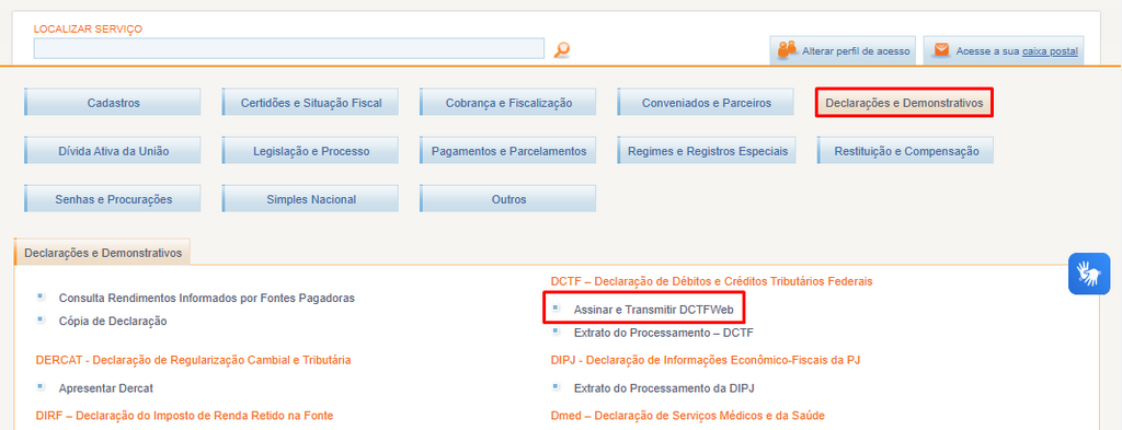 7. Acesse em seguida o Portal e-CAC. Ao efetuar o login, clique no menu Declarações e Demonstrativos > Assinar e Transmitir DCTFWeb;