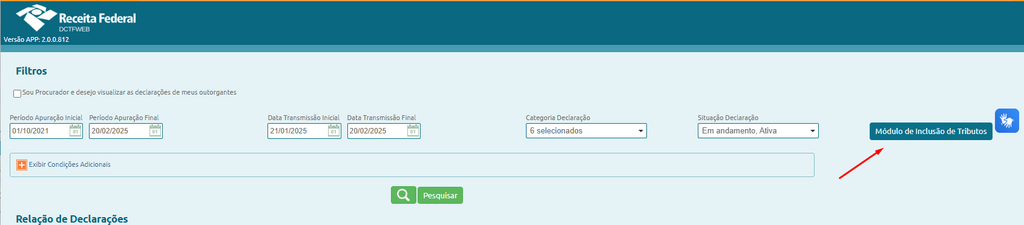 8. Na tela inicial da DCTFWEB, clique na opção Módulo de Inclusão de Tributos;