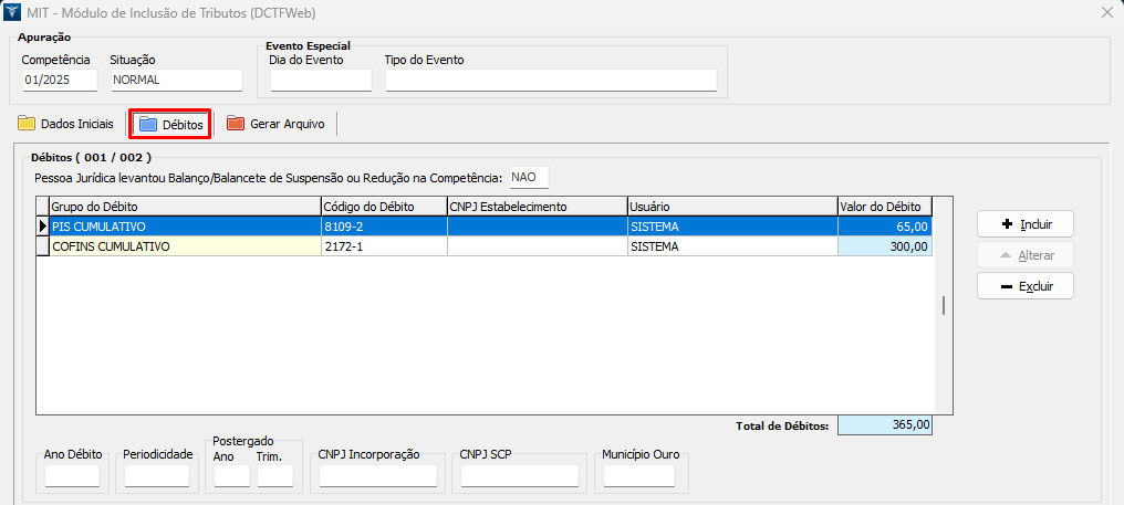 5. Observe os dados gerados nas palhetas "Dados Iniciais e Débitos". Confira se as informações estão corretas, os débitos serão apresentados a partir do processamento dos tributos em Processamento > Apuração de Tributos. O sistema efetuará a geração automática dos débitos PIS, COFINS, IRPJ, CSLL e IPI, demais grupos poderão ser incluídos manualmente na opção Débitos.