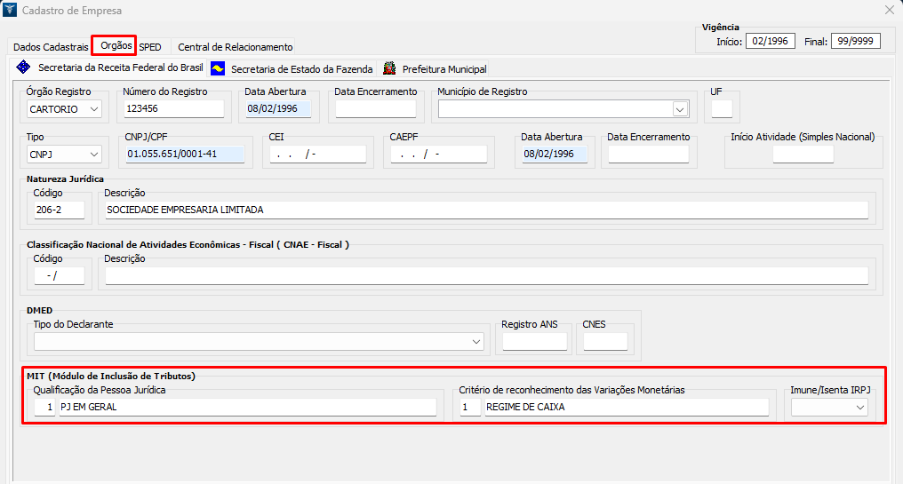 2. Clique na palheta Órgãos, informe os campos MIT e Critério de reconhecimento das Variações Monetárias;