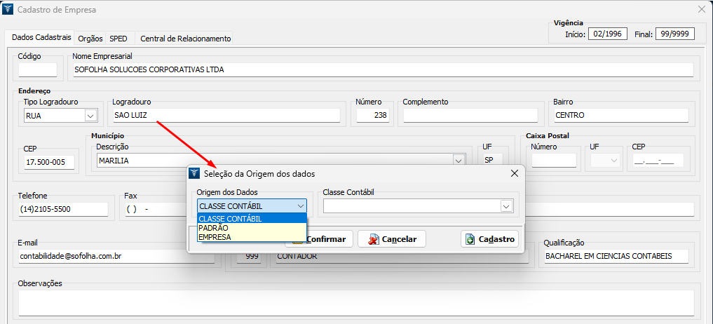 Todas as opções em Origem dos Dados estão disponíveis somente na finalização do cadastro da empresa, dessa forma não é possível incluir ou excluir a Classe Contábil de uma empresa já cadastrada, ou mesmo utilizar as opções Padrão ou Empresa, nesta mesma condição.