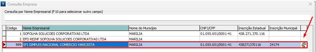 A mesma identificação é possível através da opção Consulta Empresa, ao pressionar a tecla F10 na tela inicial do sistema. Observe a empresa em destaque.