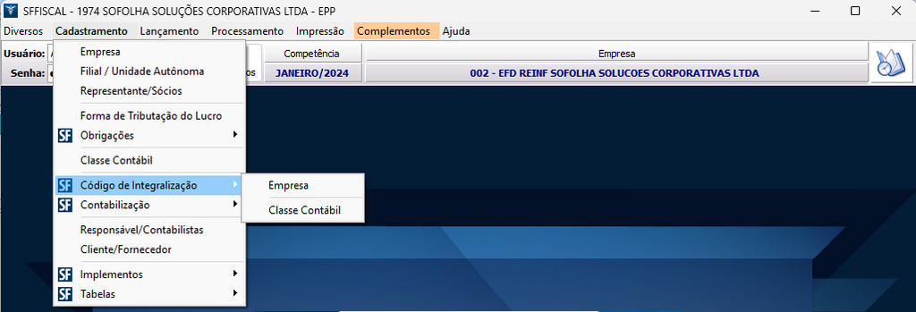 1. Na tela principal do sistema, acesse o menu Cadastramento > Código de Integralização > Empresa/Classe Contábil;