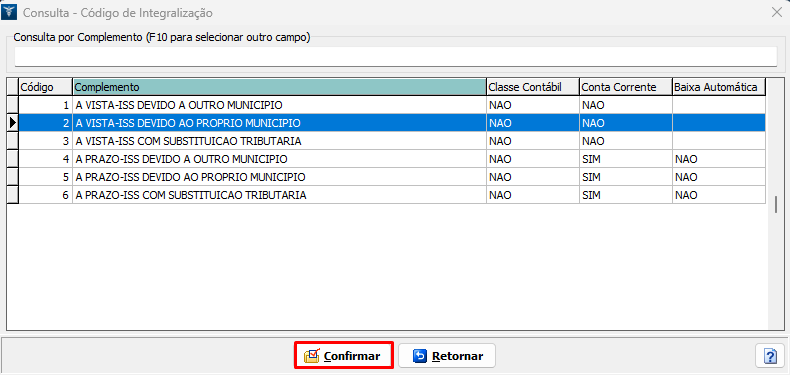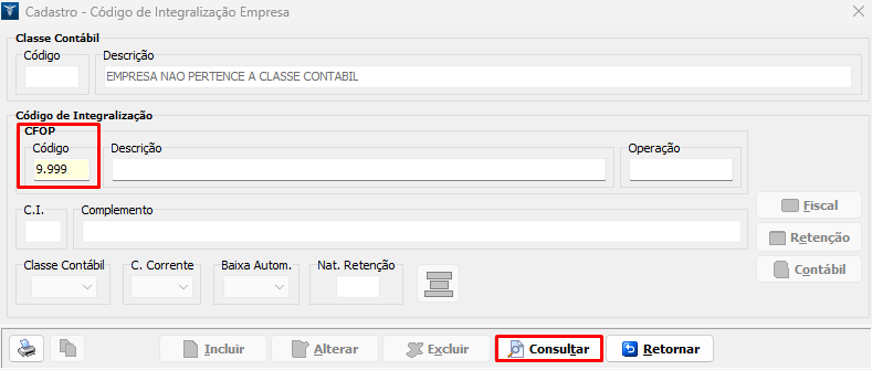 3. Na tela seguinte, informe no campo Código o CFOP e consulte o C.I. em uso nas notas fiscais. No exemplo abaixo trataremos a empresa prestador de serviço;